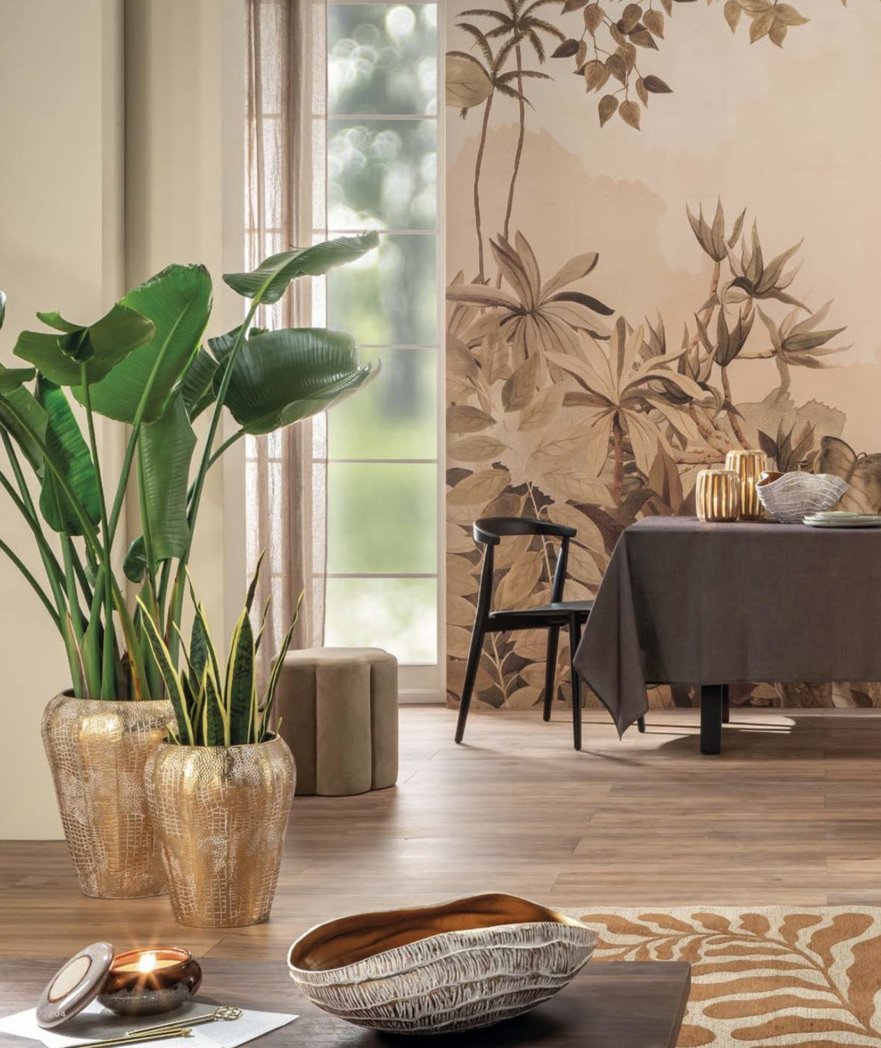 Le superfici lavorate e le tonalità calde richiamano l’inconfondibile stile Ethno Chic, dove artigianalità e modernità si fondono in un’estetica elegante e contemporanea.