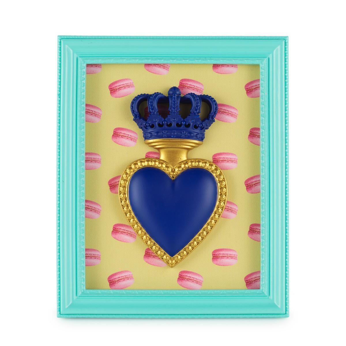 La cornice Ton Cœur presenta un cuore tridimensionale coronato, in un vibrante blu intenso, incorniciato da una struttura rosso brillante ricca di dettagli.