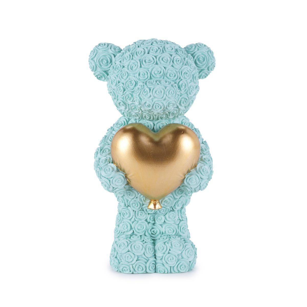 L’orsetto New Enfant, realizzato in un delicato azzurro effetto rose, stringe tra le zampine un cuore dorato che illumina la figura e aggiunge un tocco prezioso.
