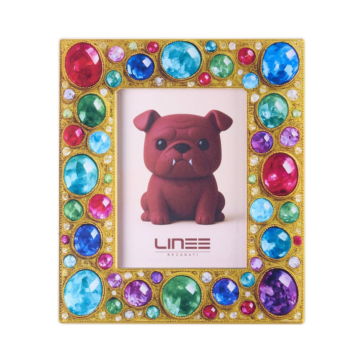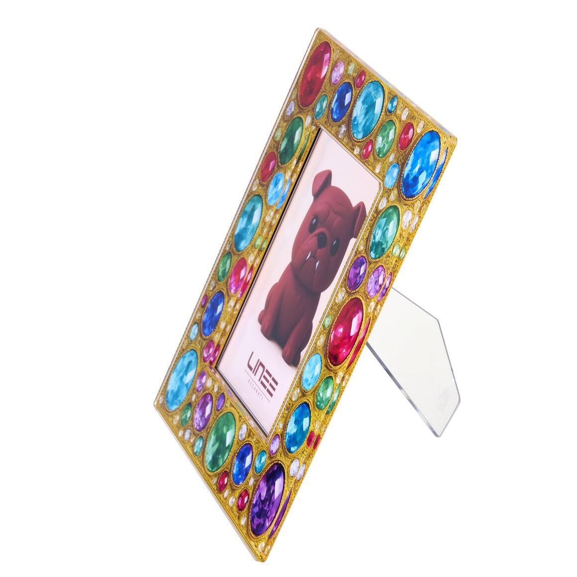 Le sue cornici dorate, arricchite da gemme luminose e superfici materiche, custodiscono fotografie e immagini affettive come piccoli tesori domestici.