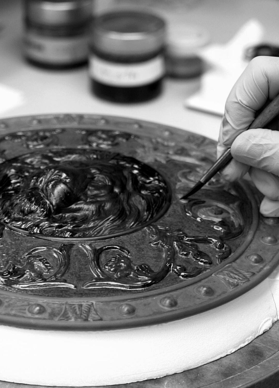 Una scultura che sembra emergere direttamente dall’arena dell’antica Roma: potente, solenne, scolpita in una porcellana nera che esalta ogni muscolo, ogni piega dell’armatura, ogni gesto carico di tensione.