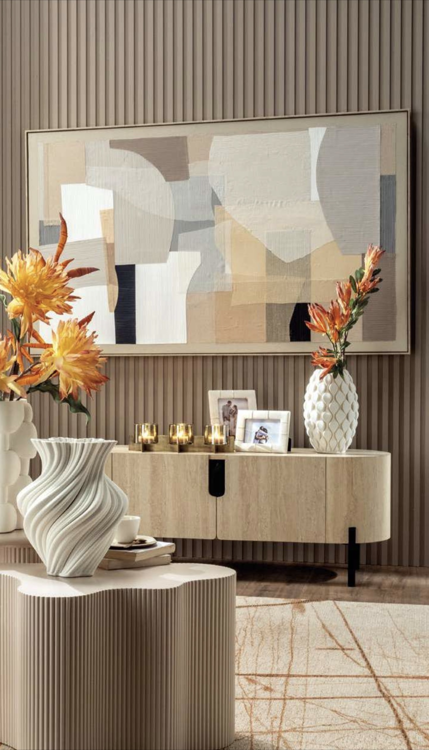 Le tonalità morbide e la combinazione di materiali donano equilibrio tra modernità e classicità, rendendolo un complemento ideale per consolle, tavoli da pranzo, madie o angoli decorativi.