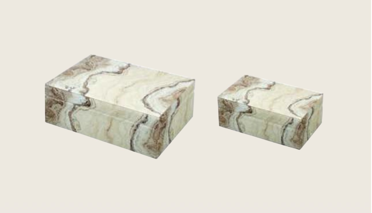 Un set di due cofanetti in vetro dal design raffinato, perfetti per aggiungere un tocco di eleganza contemporanea agli ambienti.
