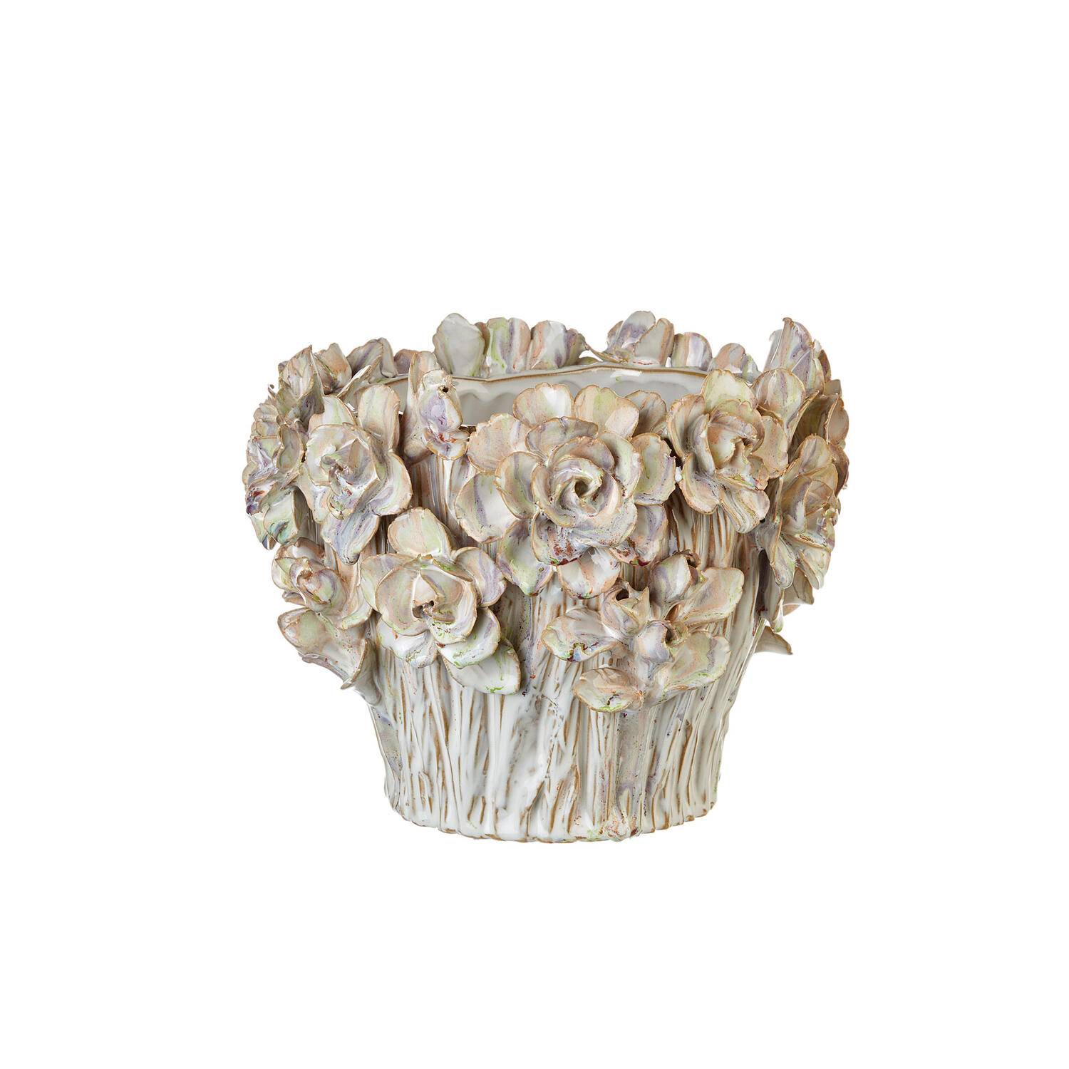 Le tonalità morbide e polverose – tra crema, rosa antico e leggere sfumature verdi – donano al pezzo un carattere romantico e senza tempo, perfetto per arricchire credenze, consolle e angoli decorativi con un tocco di eleganza artigianale.