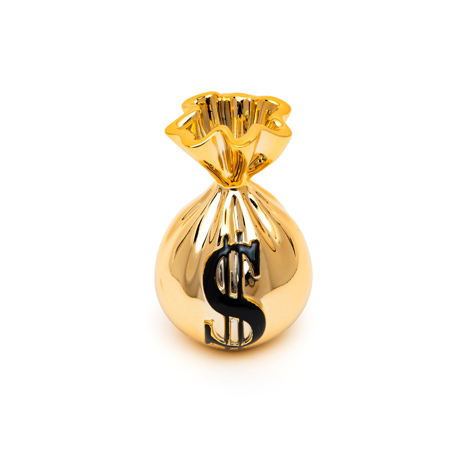 La forma iconica del sacco di denaro diventa un elemento decorativo dal forte impatto visivo, disponibile in due misure — 9,5 cm e 20 cm di altezza — per adattarsi a ogni spazio e stile.