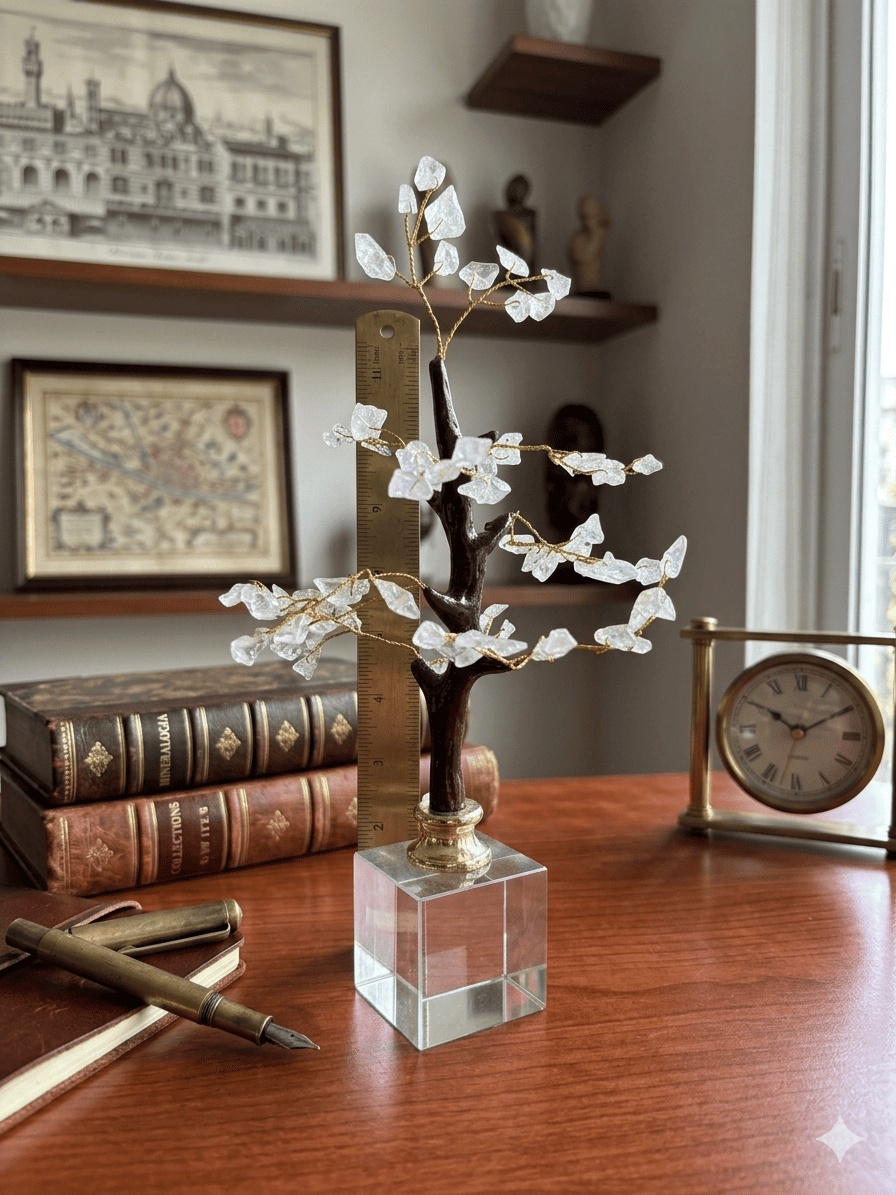 La struttura ramificata sostiene le pietre luminose, creando un effetto elegante e armonioso, mentre la base cubo aggiunge stabilità e un tocco decorativo moderno.