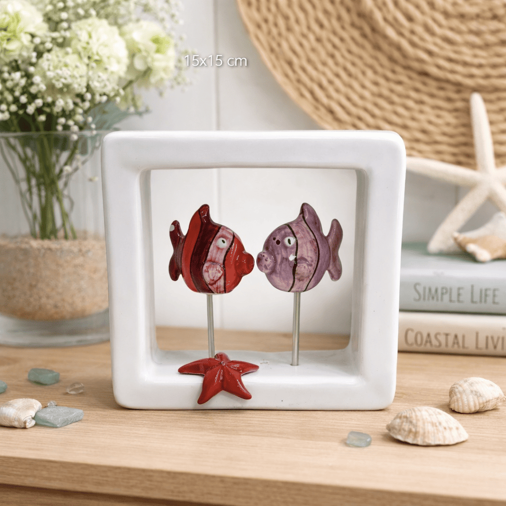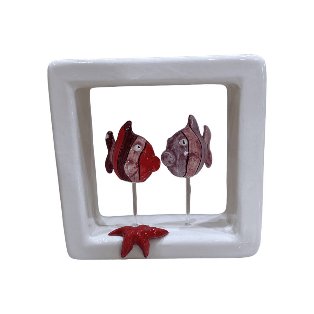 Un’elegante cornice bianca da 15x15 cm racchiude una scena marina vivace e originale: due pesci in ceramica, con sfumature rosse e varie gradazioni di viola profonde, si fronteggiano sospesi su sottili aste.