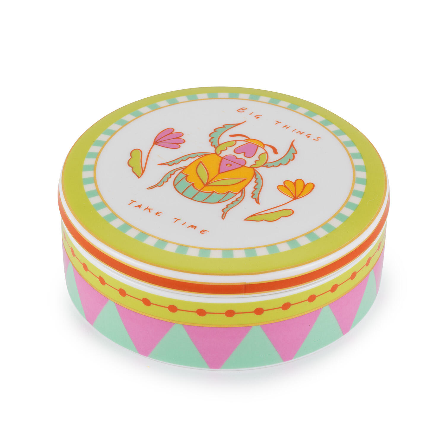 Il coperchio ospita lo scarabeo stilizzato circondato dai messaggi "BIG THINGS" e "TAKE TIME", mentre il corpo della scatola è decorato con un audace motivo a triangoli alternati in rosa e verde tiffany, profilato da linee arancioni e gialle.