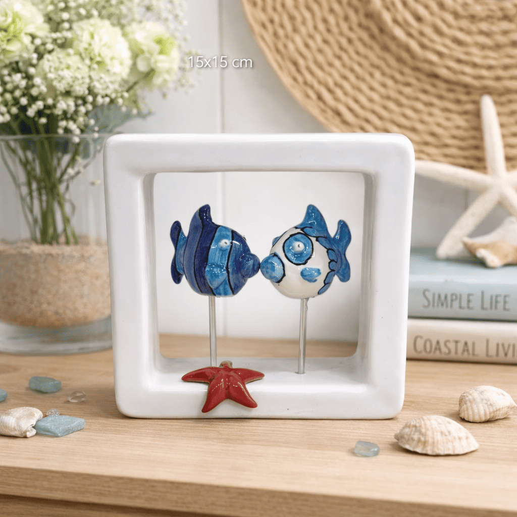 Un’elegante cornice bianca da 15x15 cm racchiude una composizione marina delicata e rilassante: due pesci in ceramica, dipinti a mano nei toni del blu e del bianco, sembrano danzare sospesi su sottili aste.