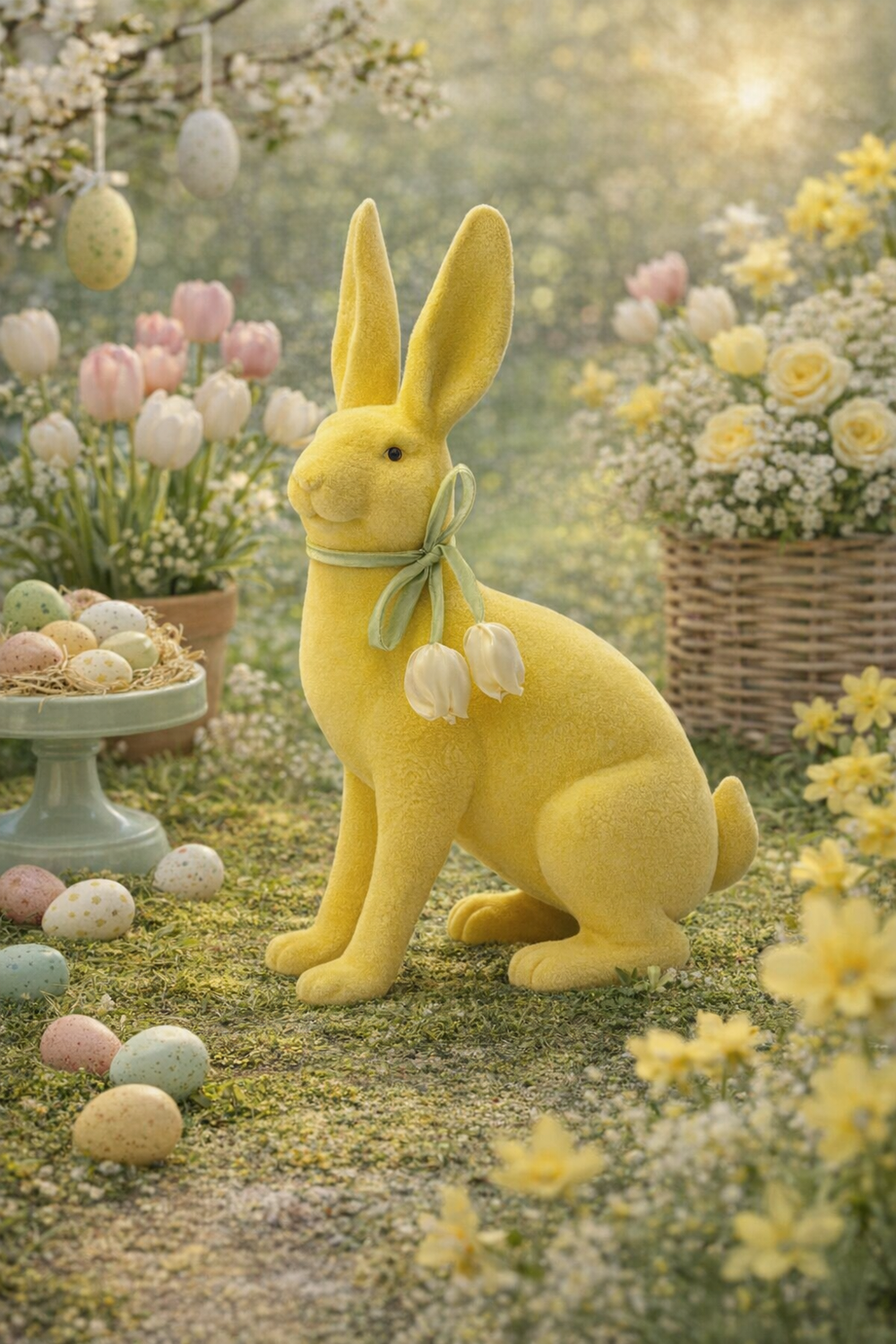 La figura, caratterizzata da una superficie vellutata e da tonalità giallo pastello, è impreziosita da un elegante fiocco verde e da un tulipano decorativo che richiama l’arrivo della bella stagione.