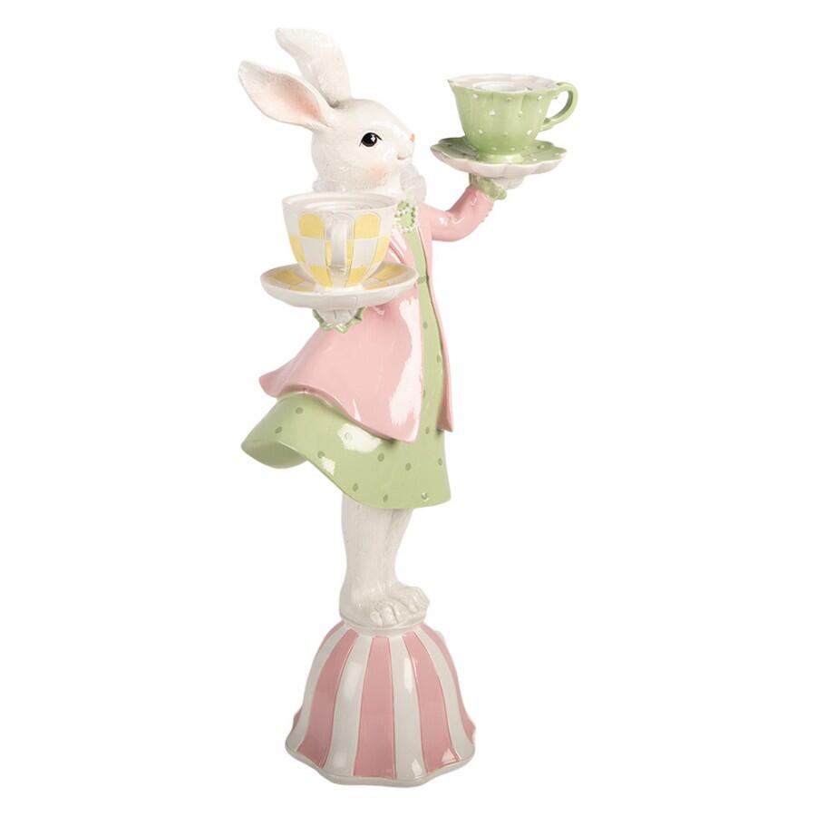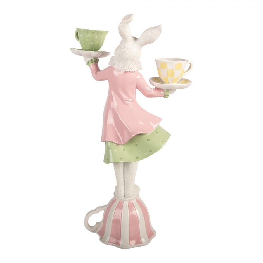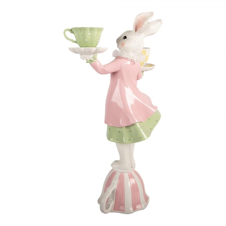 Statuetta decorativa in polyresin raffigurante un coniglietto vestito in stile fiabesco, in equilibrio su una tazza capovolta mentre regge due tazzine colorate.