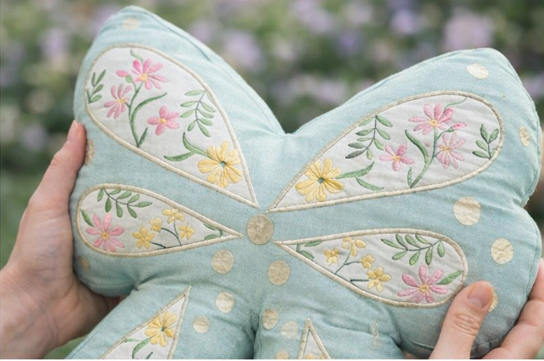 Cuscino colore celeste sagomato a forma di fiocco in 100% cotone rosa cipria, impreziosito da raffinati ricami floreali e delicati pois ricamati tono su tono.