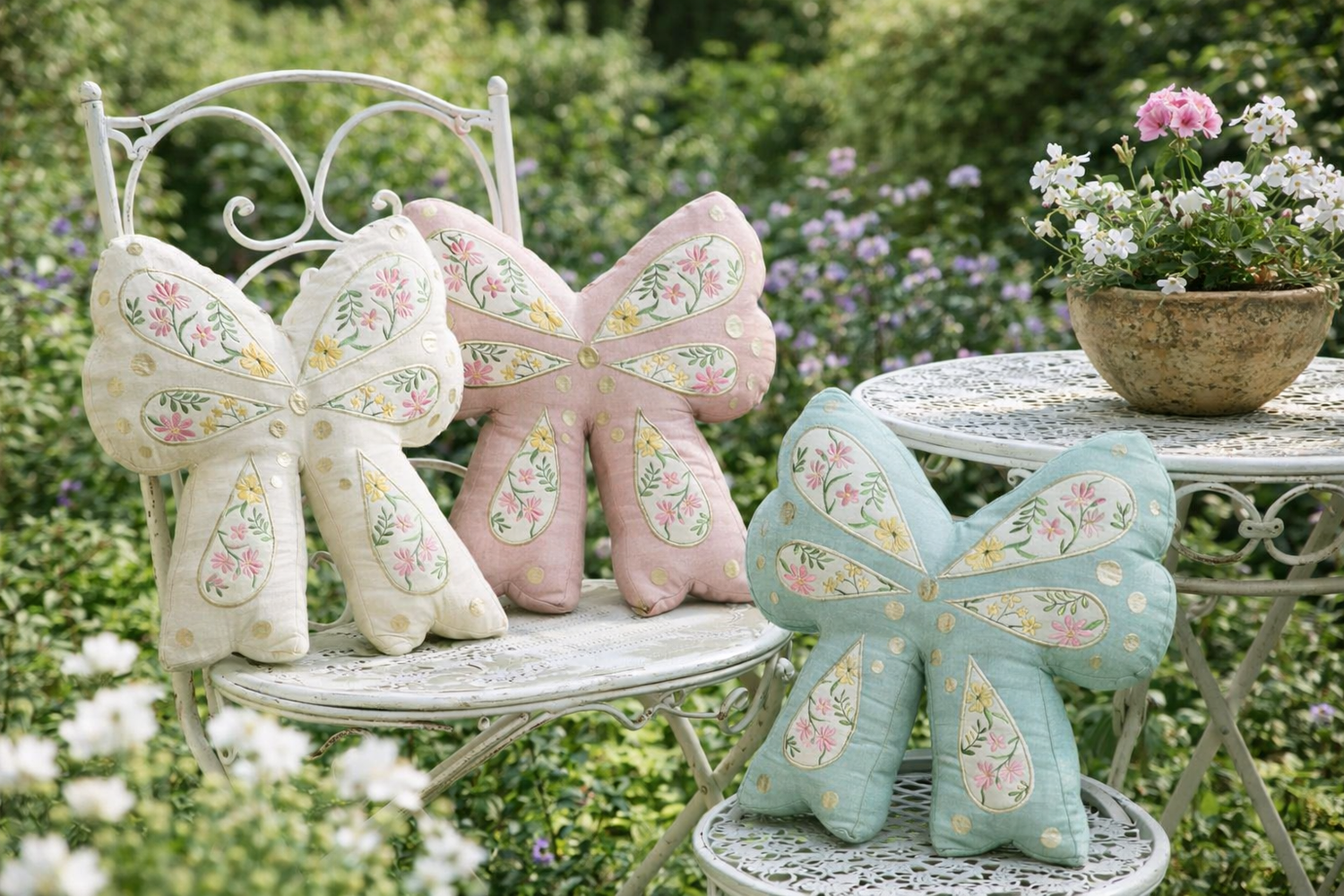Cuscino colore panna sagomato a forma di fiocco in 100% cotone rosa cipria, impreziosito da raffinati ricami floreali e delicati pois ricamati tono su tono.