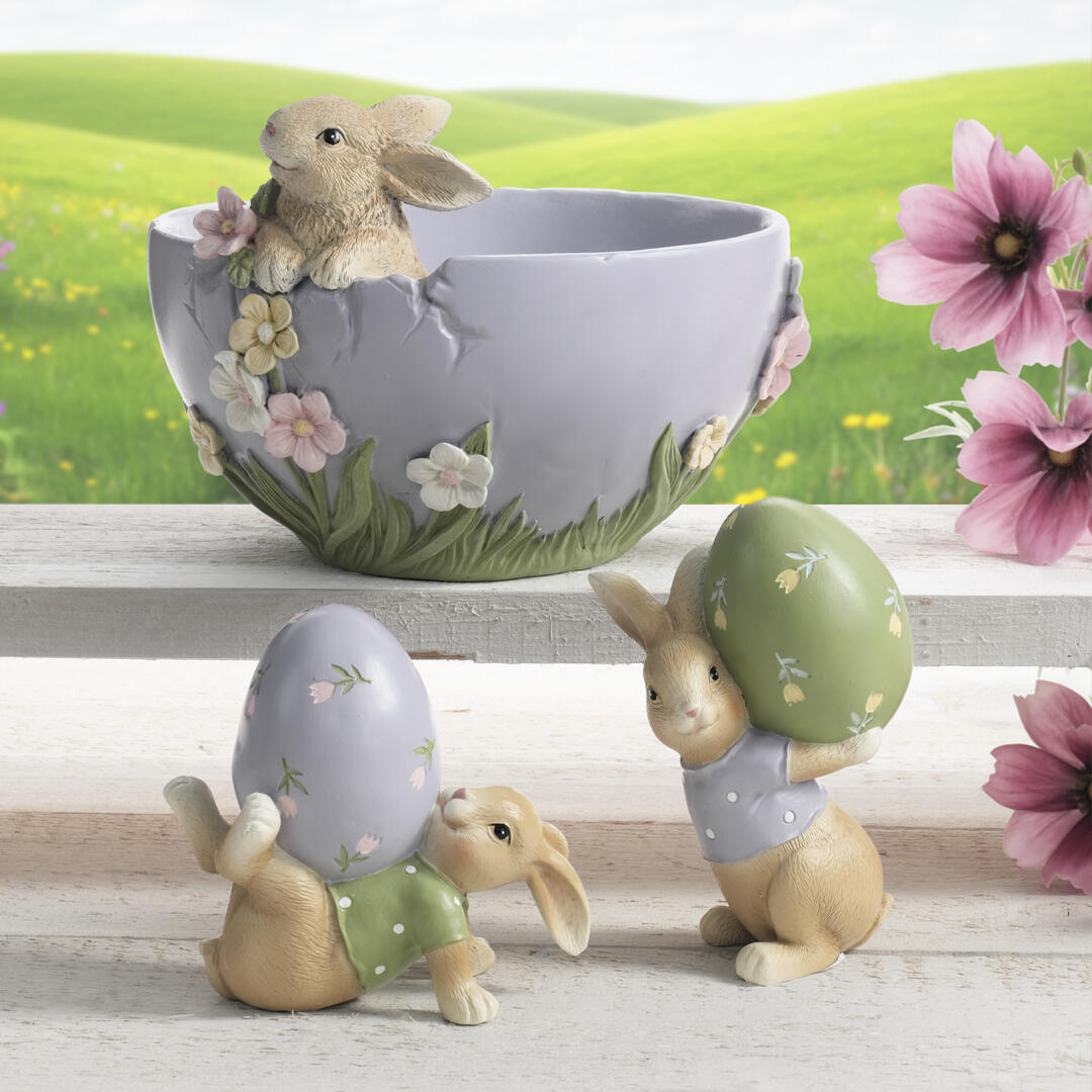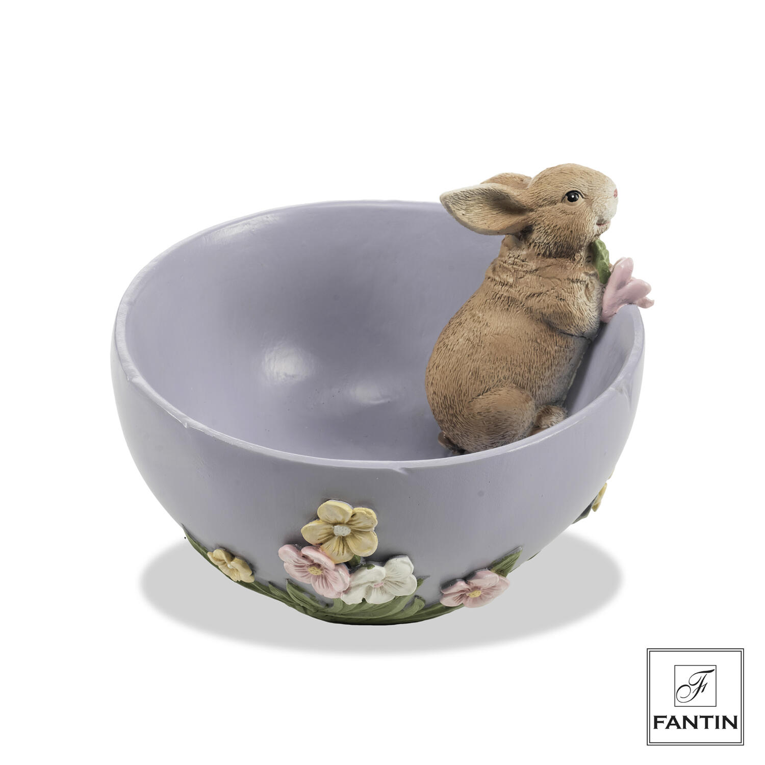 Realizzata in polvere di pietra e resina, combina la solidità del materiale con una lavorazione ricca di dettagli: la ciotola presenta un bordo floreale delicato, mentre un tenero coniglio spunta dal lato, creando un effetto decorativo armonioso e raffinato.