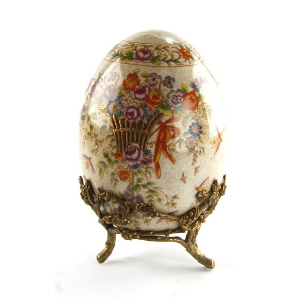 La sua base ornamentale in bronzo valorizza il design tradizionale dell’uovo, trasformandolo in un complemento d’arredo ideale per caminetti, vetrine, credenze e angoli espositivi.