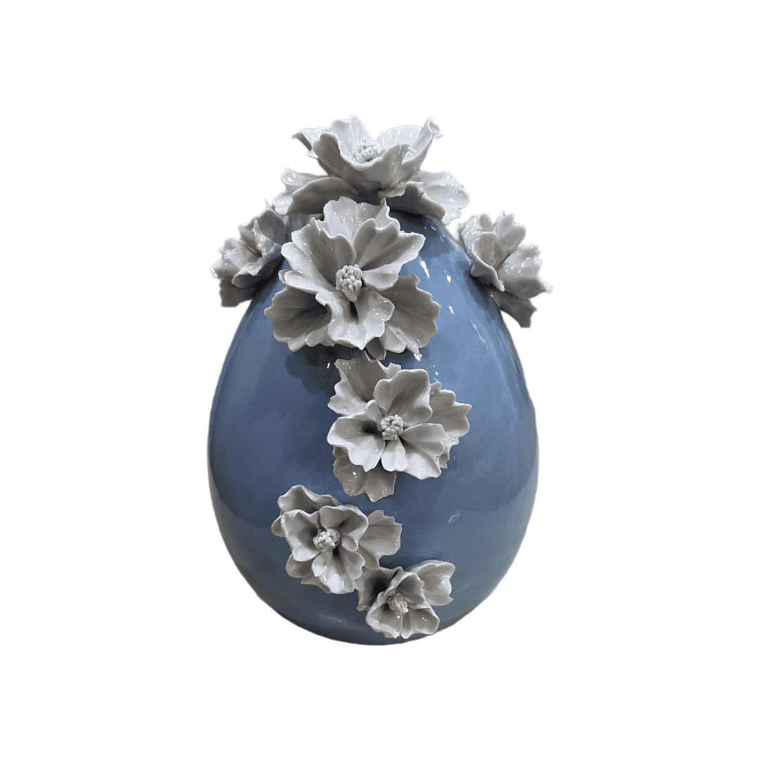 L'Armonia dei DettagliQuesto pezzo da collezione, alto 20 cm, si distingue per la pulizia delle linee della sua porcellana panna, che fa da tela perfetta per il decoro floreale centrale. Il vero protagonista è il nastro in velluto acqua marina, un colore vibrante ma delicato che avvolge l'uovo in un abbraccio sartoriale.