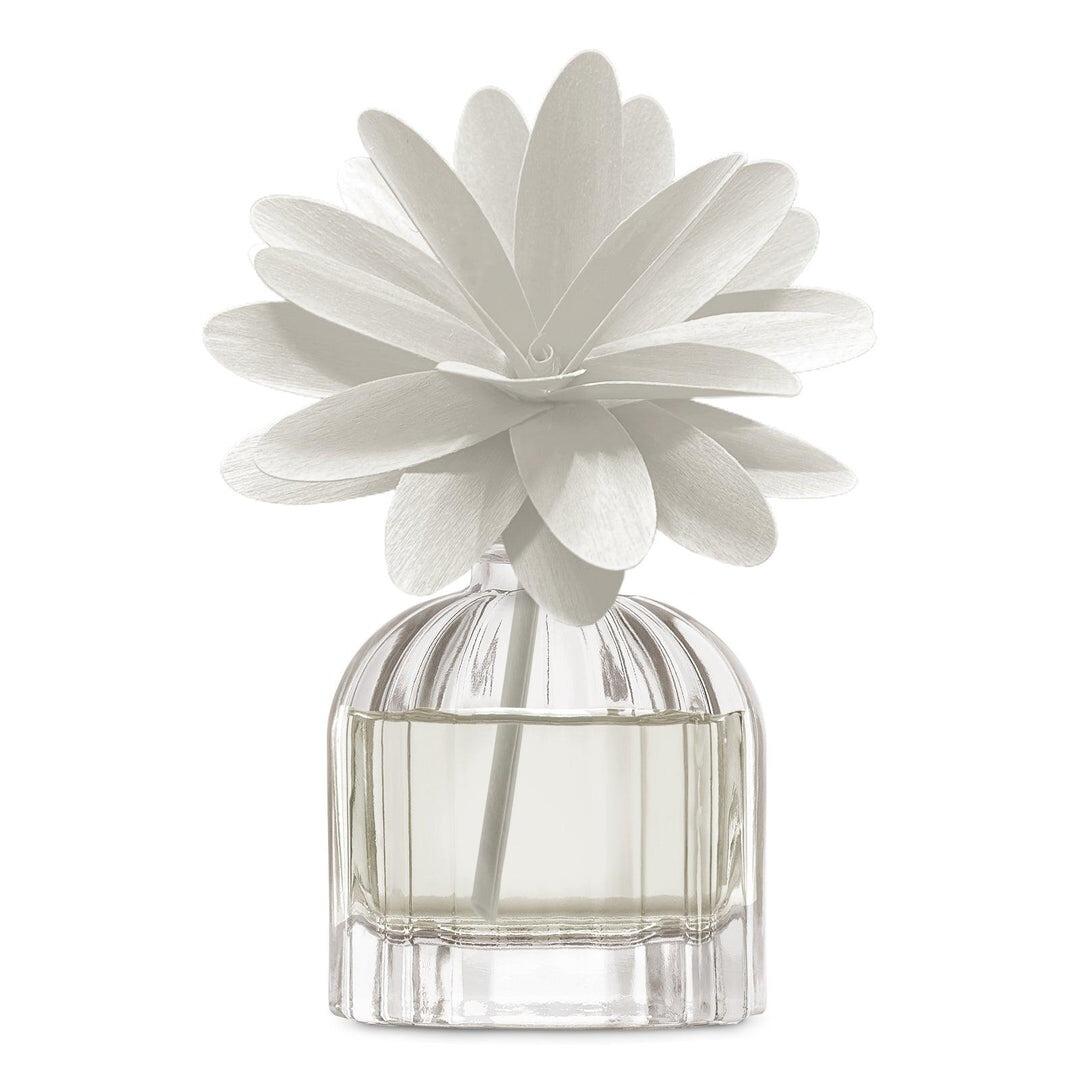 Profumatore per ambiente in una raffinata confezione di vetro con diffusore a forma di fiore in legno di betulla naturale realizzato a mano.
