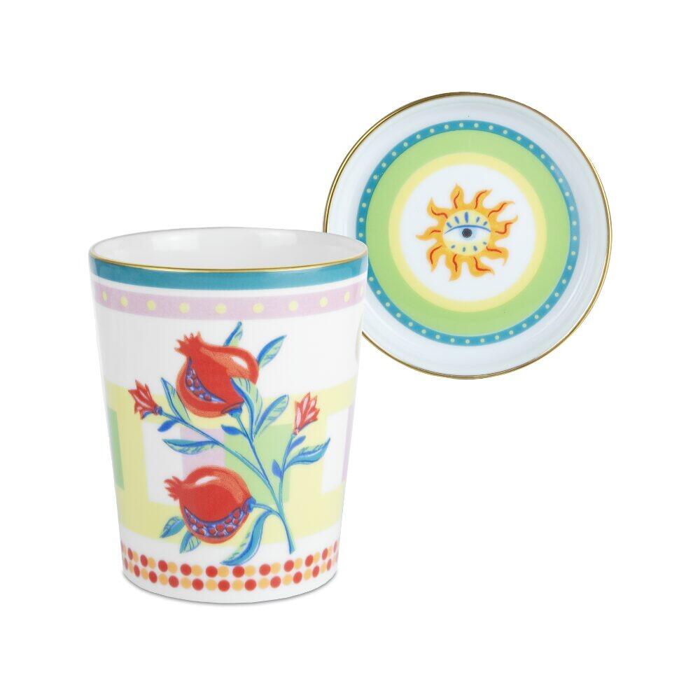 Bicchiere con piattino/coperchio in porcellana della collezione “Mamma Mia” concepita con l’obiettivo di infondere vitalità non solo sulla tavola, ma anche in ogni angolo della casa attraverso un caleidoscopio di colori, simboli intriganti, scritte misteriose e disegni avvincenti.