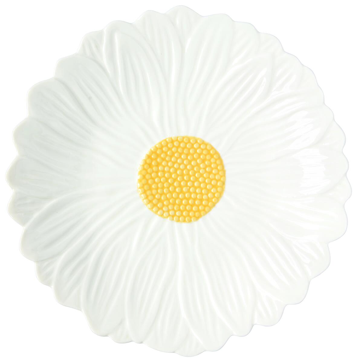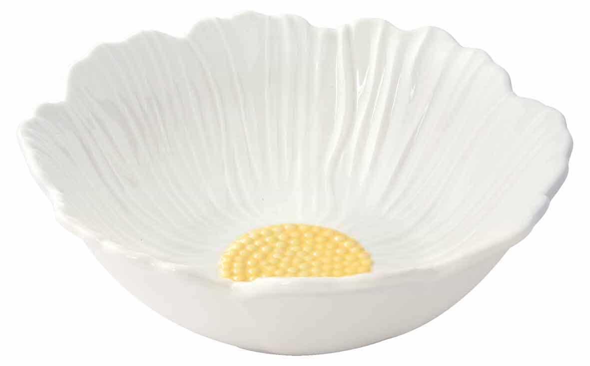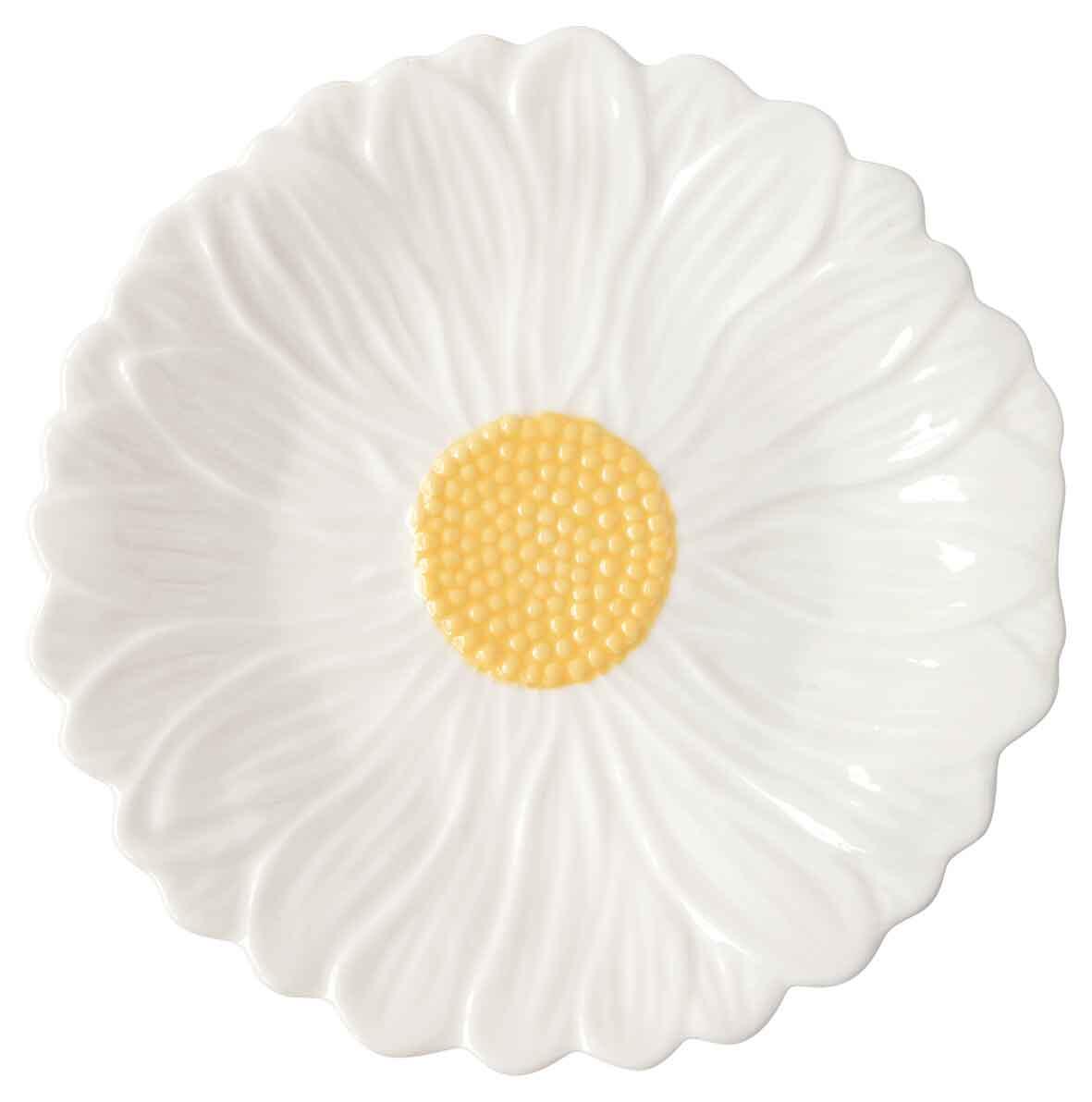 Ogni pezzo è curato nei dettagli, con superficie lucida, centro giallo e petali bianchi che donano un tocco naturale e decorativo alla tavola.